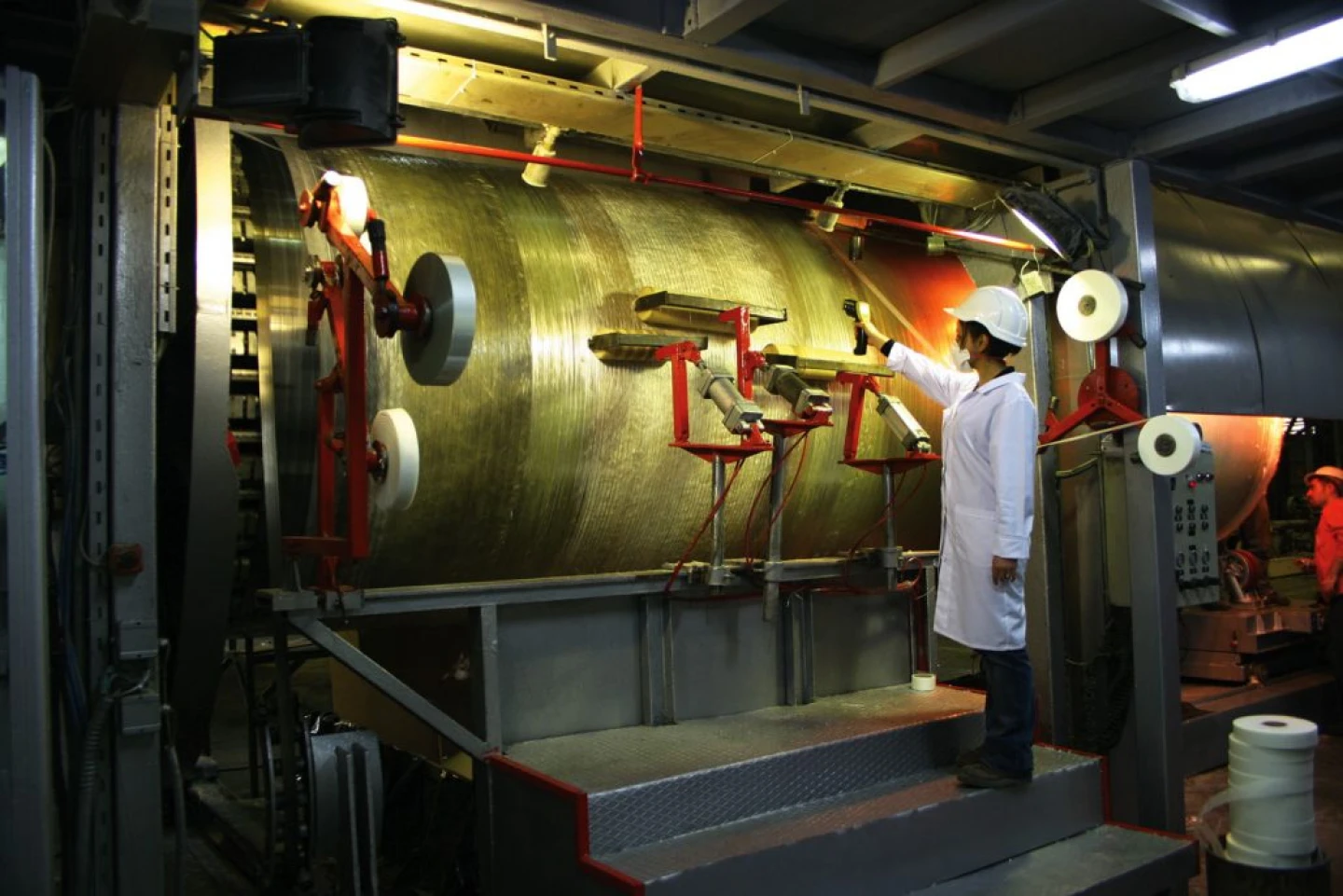 Etap utwardzania laminatu odbywa się poprzez nagrzewanie – zastosowane elementy grzejne równomiernie podnoszą temperaturę w strefie utwardzania. Rozkład temperatury jest na bieżąco mierzony w wielu punktach i prezentowany graficznie na monitorze komputera, co pozwala zachować najwyższą jakość produktu końcowego.